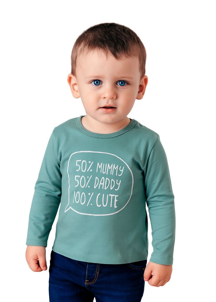 GE9006Блузката е в цвят мента, с дълъг ръкав. Отпред има бял надпис " 50% Mummy, 50% Daddy, 100% Cute". На лявото рамо има две тик-так копченца за по-лесно обличане.Марка: GeorgeСъстав: 100% памук