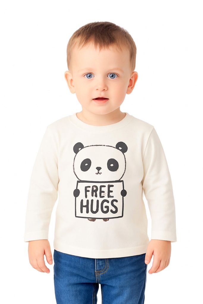 DGE4024Блузката е с дълъг ръкав, в бяло, с тъмносива фигурка на панда и надпис FREE HUGS. Има две тик-так копченца на лявото рамо за по-лесно обличане.Марка: GeorgeСъстав: 100% памук