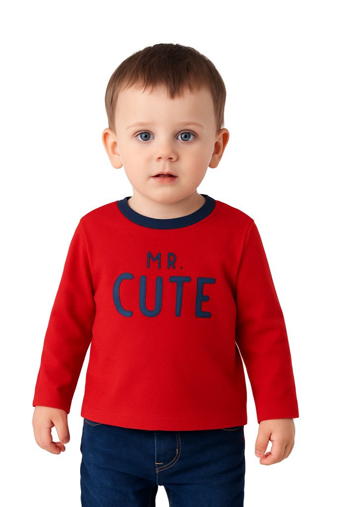 DGE2018-2Блузата е с дълъг ръкав, в червен цвят, с тъмносин ластик около врата. Отпред има надпис "Mr. CUTE" в синьо.Марка: GeorgeСъстав: 100% памук