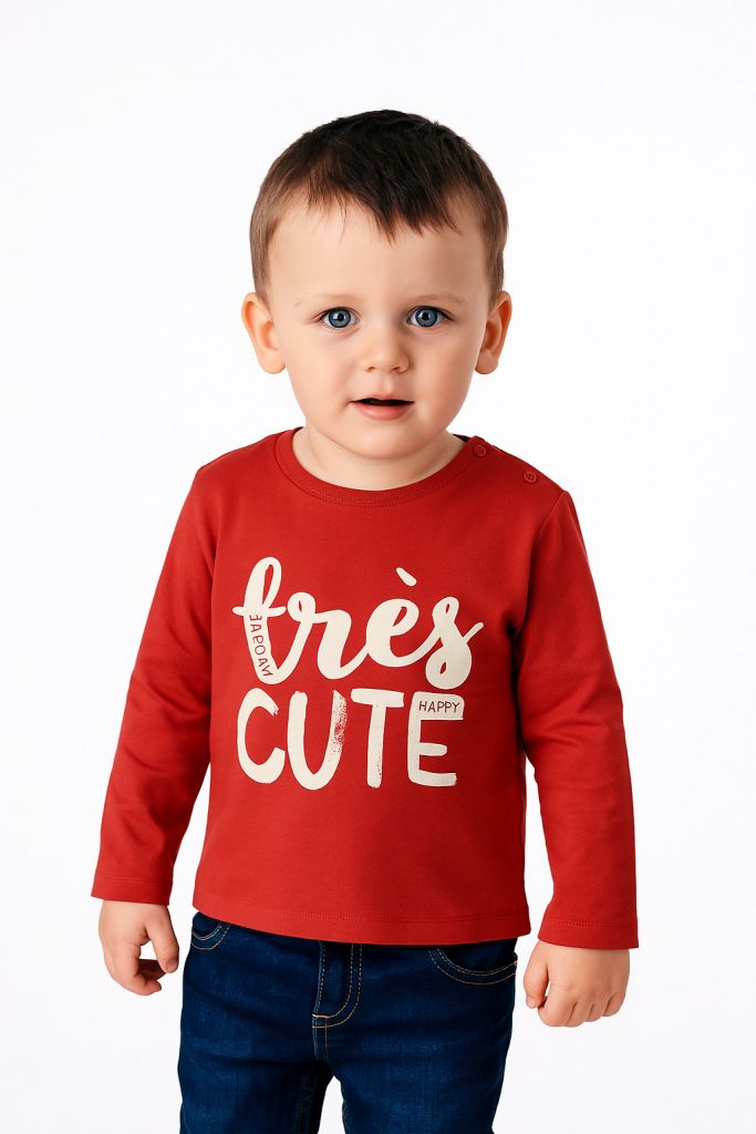 GTES1024Блузката е в керемиденочервен цвят, с голям бял надпис "Tres cute" отпред. Има две копченца на лявото рамо за по-лесно обличане.Марка: F&FСъстав: 100% памук