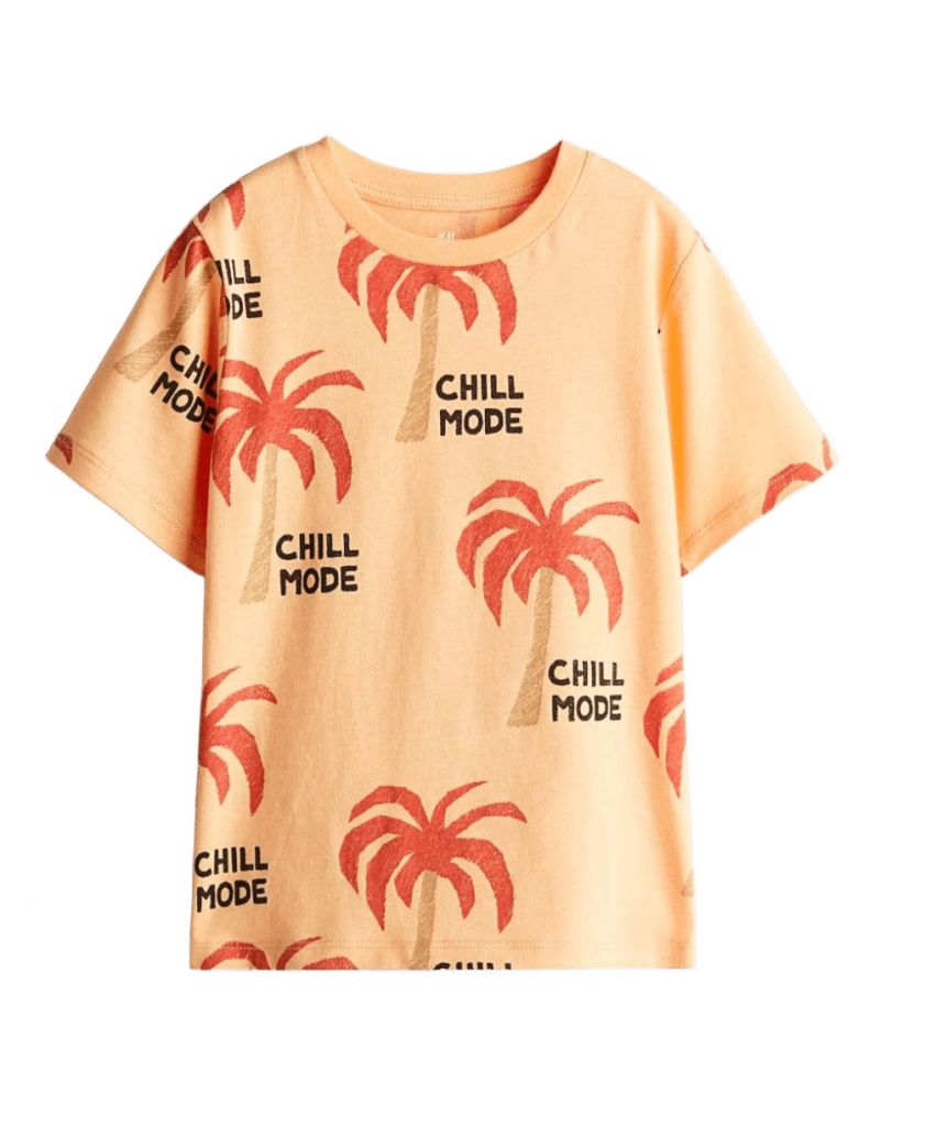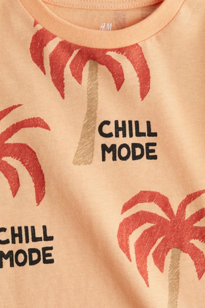 DHM1347Тениската е в светлооранжево, с големи фигурки на палми в тъмнооранжево и кафяво и черни надписи CHILL MODE.Марка: H&MСъстав: 100% памук