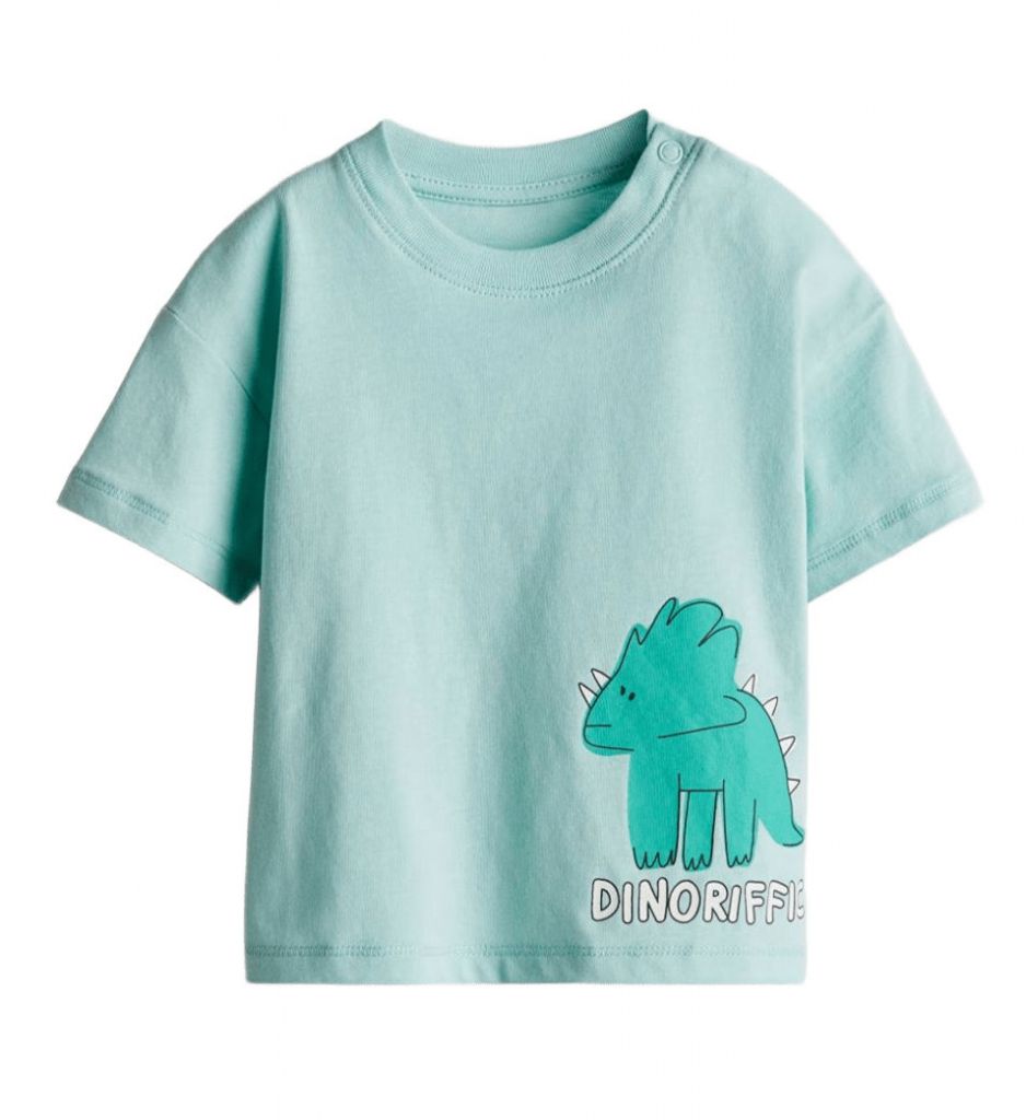 DHM1344Тениската е в цвят мента, с голяма фигурка на зелен динозавър в долната лява част.Марка: H&MСъстав: 100% памук