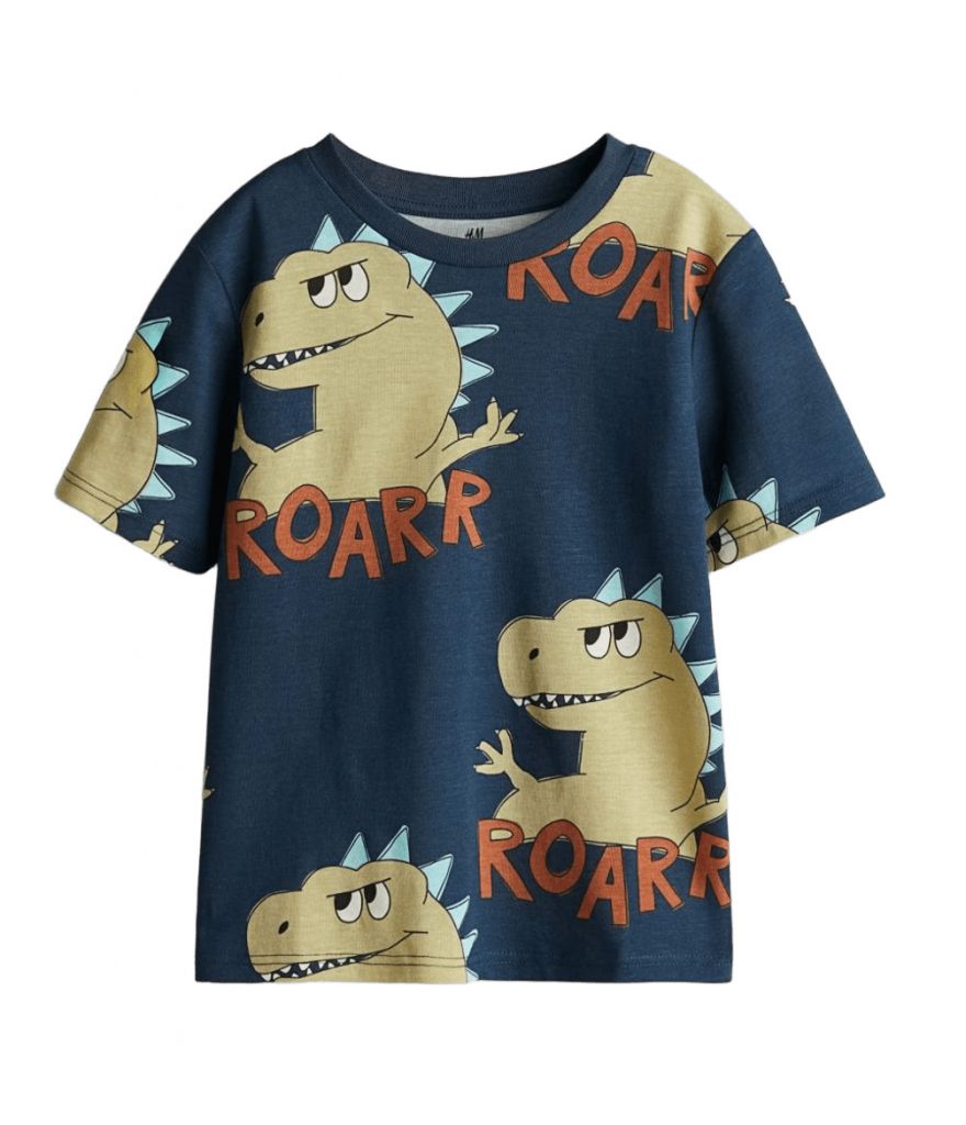 DHM1345Тениската е в тъмносив цвят, с големи фигурки на бежови динозаври и кафяви надписи "ROARRR".Марка: H&MСъстав: 100% памук
