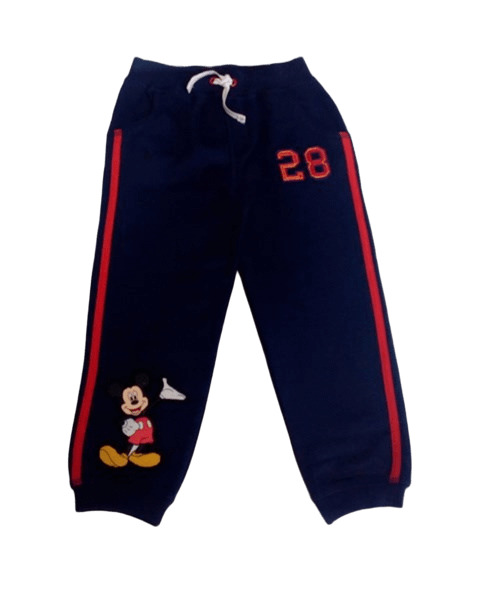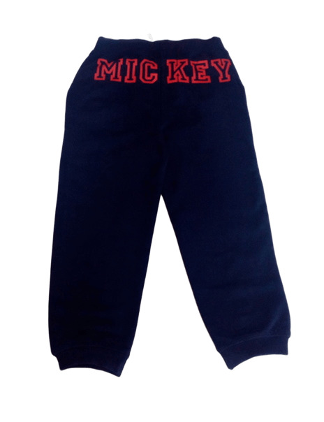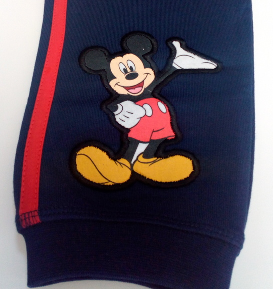 Долнището е леко ватирано, в тъмносин цвят с червен кант. Има два джоба, релефна цифра 28 отляво, а в долния край на десния крачол - фигурка на Мики Маус от плат и бродерия. Отзад има голям червен надпис MICKEY.