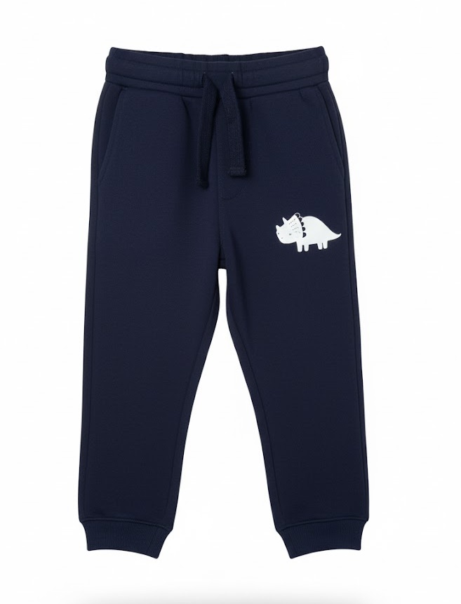 GGE675-1Долнището е леко ватирано, в тъмносин цвят, с бяла фигурка на динозавър отляво. Има два джоба и шнур за регулиране в талията.Марка: GeorgeСъстав: 80% памук, 20% полиестер