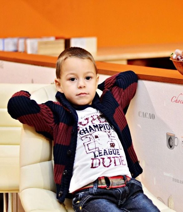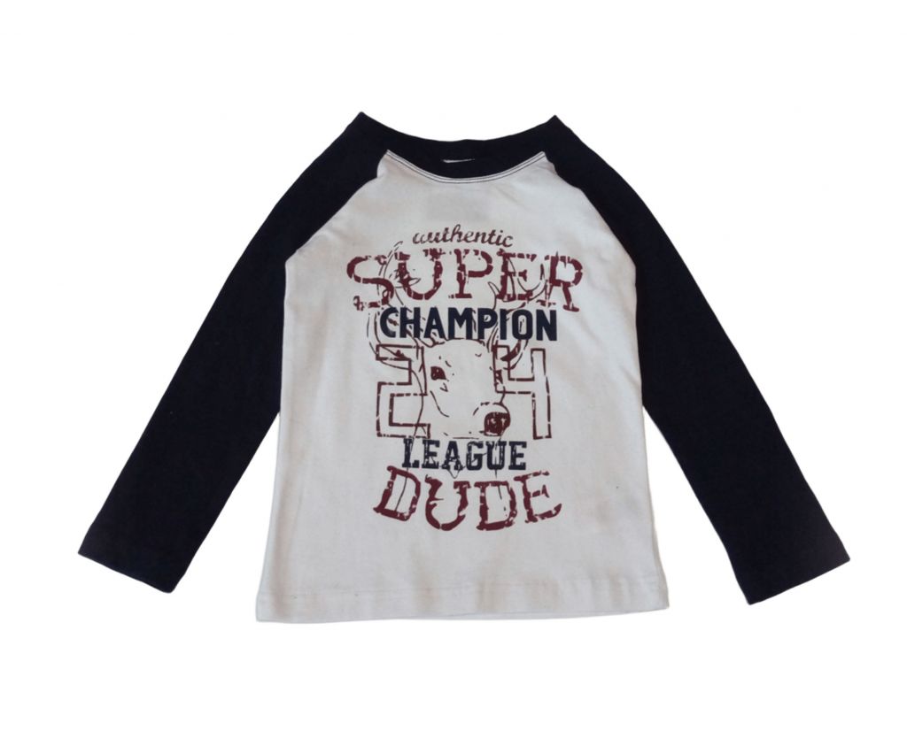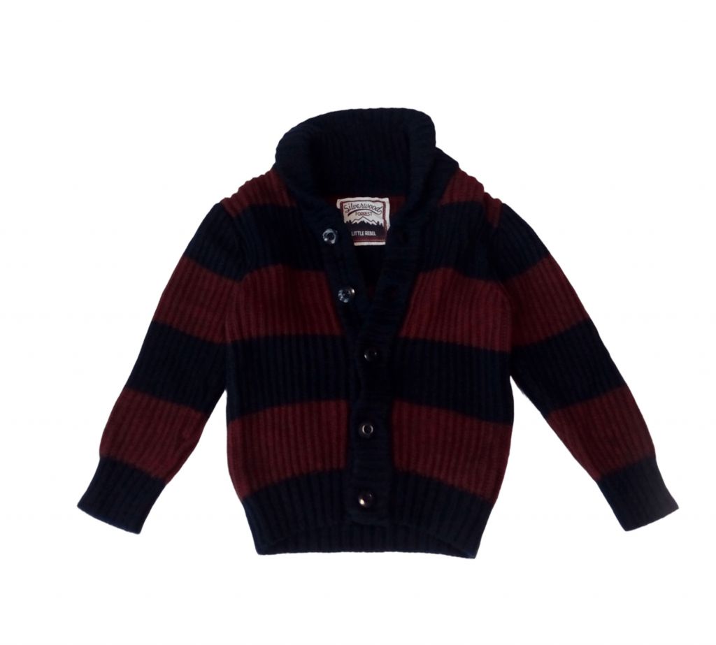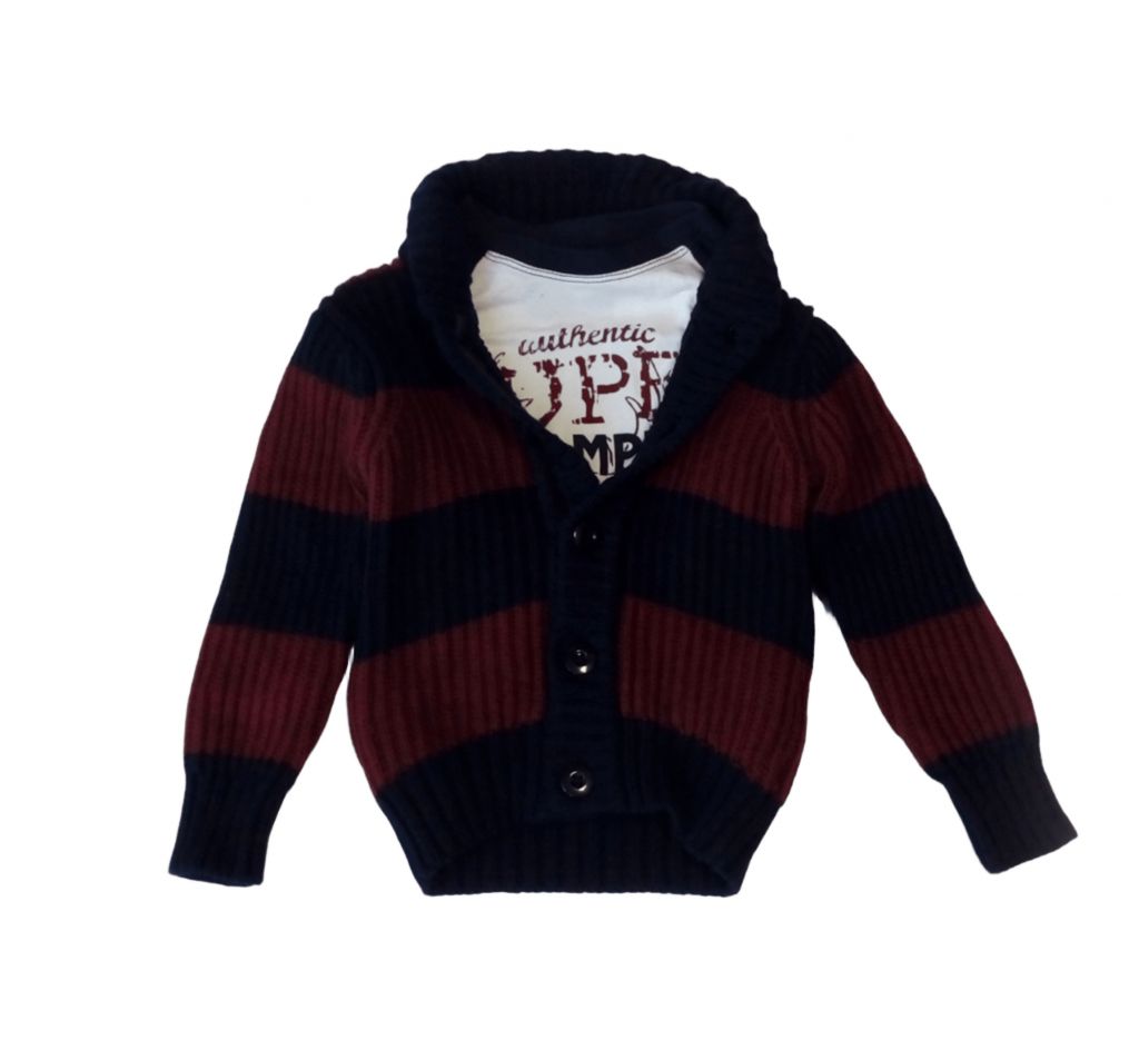 Комплектът се състои от блуза с дълъг ръкав и плътна плетена жилетка. Блузата е бяла, с реглан ръкав в тъмносиньо и надписи отпред. Жилетката е на широко райе в тъмносиньо и бордо, със заоблена яка. Закопчава се с пет копчета. Частите могат да се носят и поотделно, съчетани с други продукти и цветови комбинации.