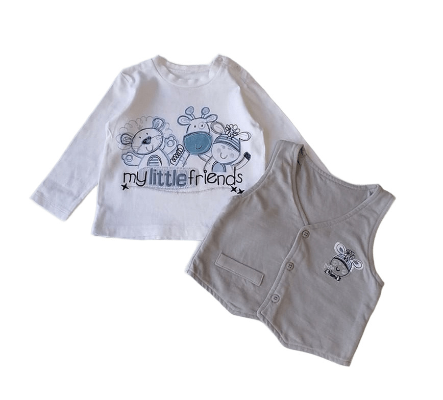 Комплектът се състои от памучни блузка и елече. Блузката е с дълъг ръкав, в бяло, с фигурки на животни - съчетание на рисунка, апликация от плат и бродиран надпис "My little friends". Има две копченца на лявото рамо за лесно обличане. Елечето е сиво, с имитация на джобче отдясно и малка фигурка от лявата страна, с трикотажна подплата и три копчета отпред.