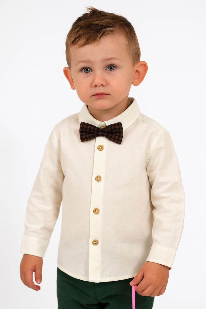 Комплектът се състои от риза с дълъг ръкав в цвят слонова кост и папийонка от кариран плат в тъмносиньо и кафяво.