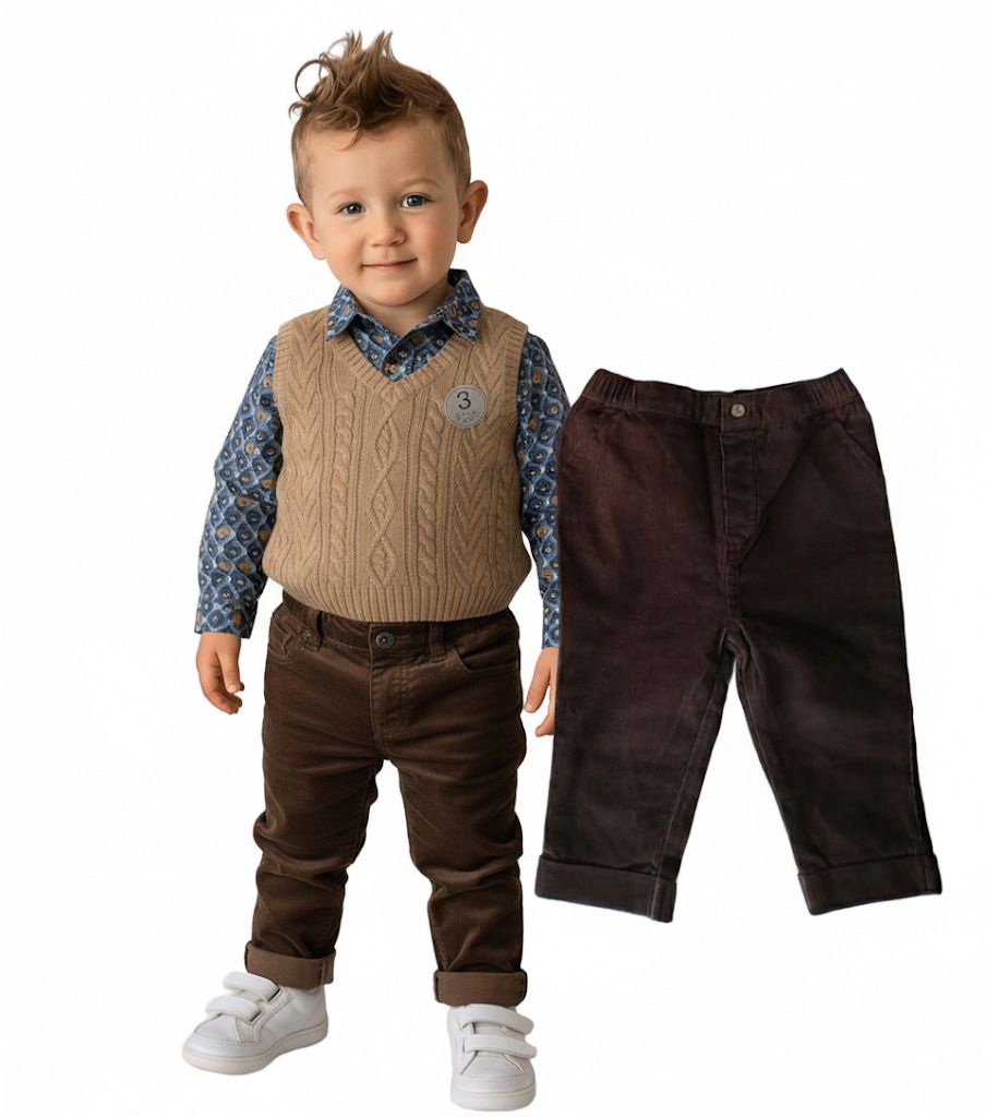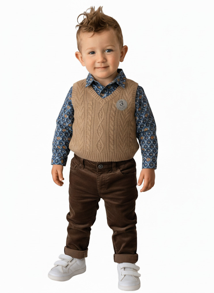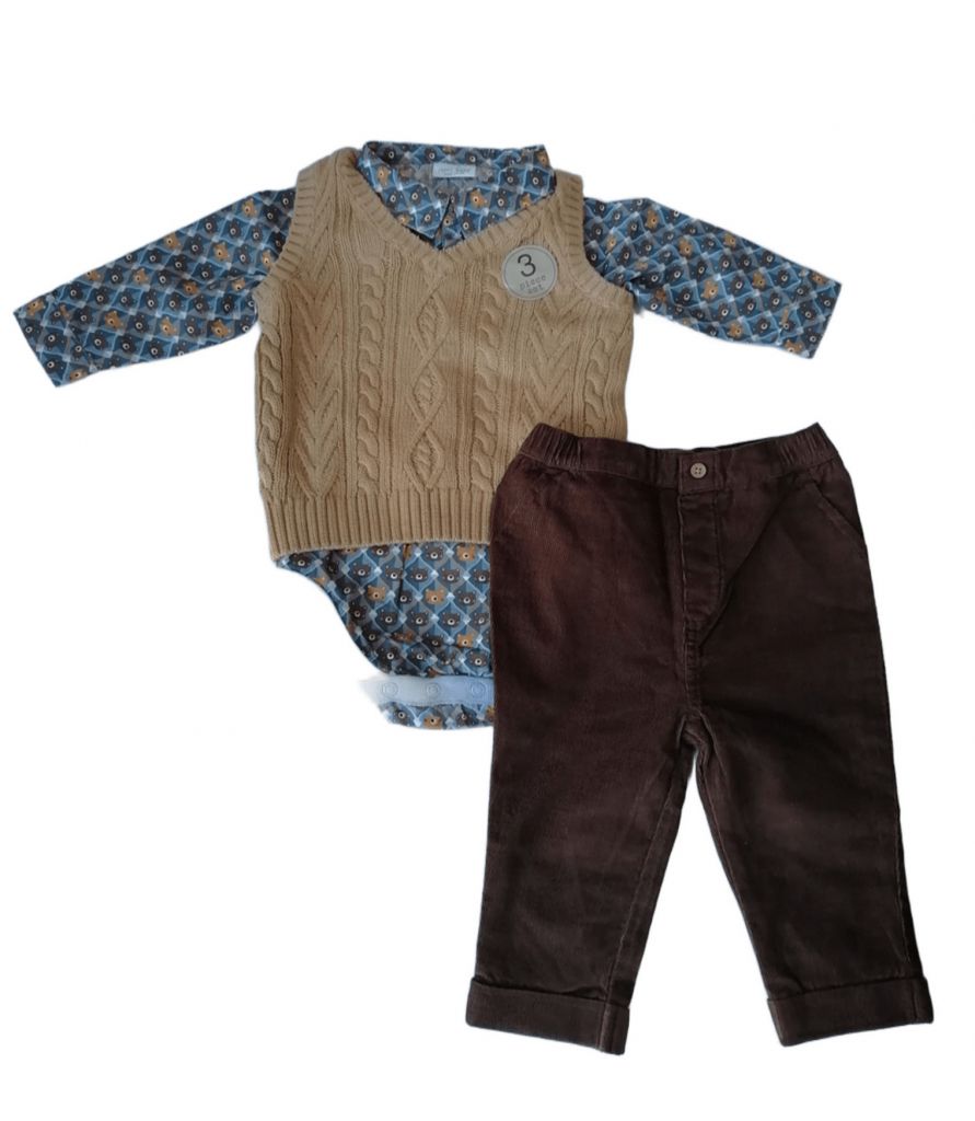 Комплектът се състои от синя боди риза, бежов пуловер и кафяви джинси. Ризата е с дълъг ръкав, с дребни фигурки на кафяви мечета и четири копчета отпред . Пуловерът е без ръкав, в цвят охра, с големи плетеници на предницата. Джинсите са тъмнокафяви, с фин релеф на плата и ластична талия.