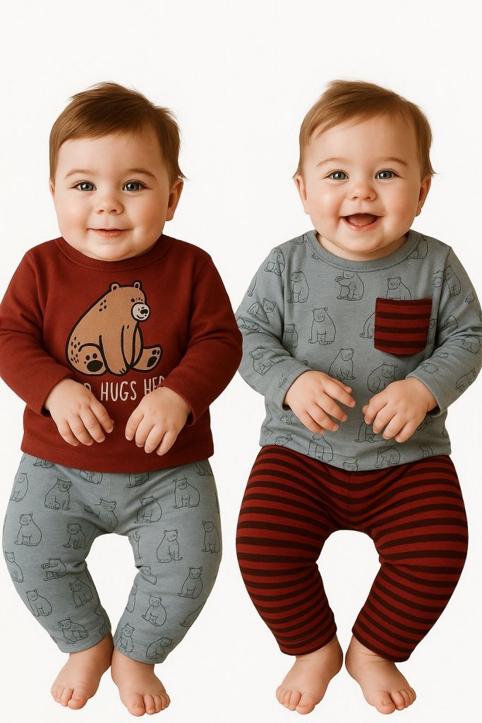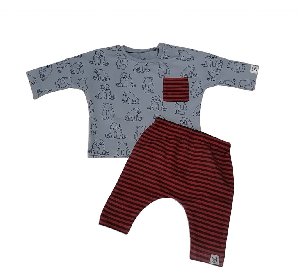 Комплектът се състои от блузка и долнище. Блузката е в светлосин цвят, с тъмносини фигурки на мечета и джобче на кафяво райе. Закопчава се с две тик-так копченца на лявото рамо. Долнището също е на райе в кестеняво и тъмнокафяво.