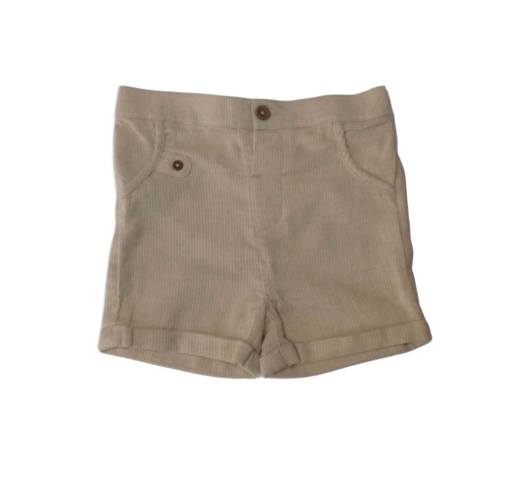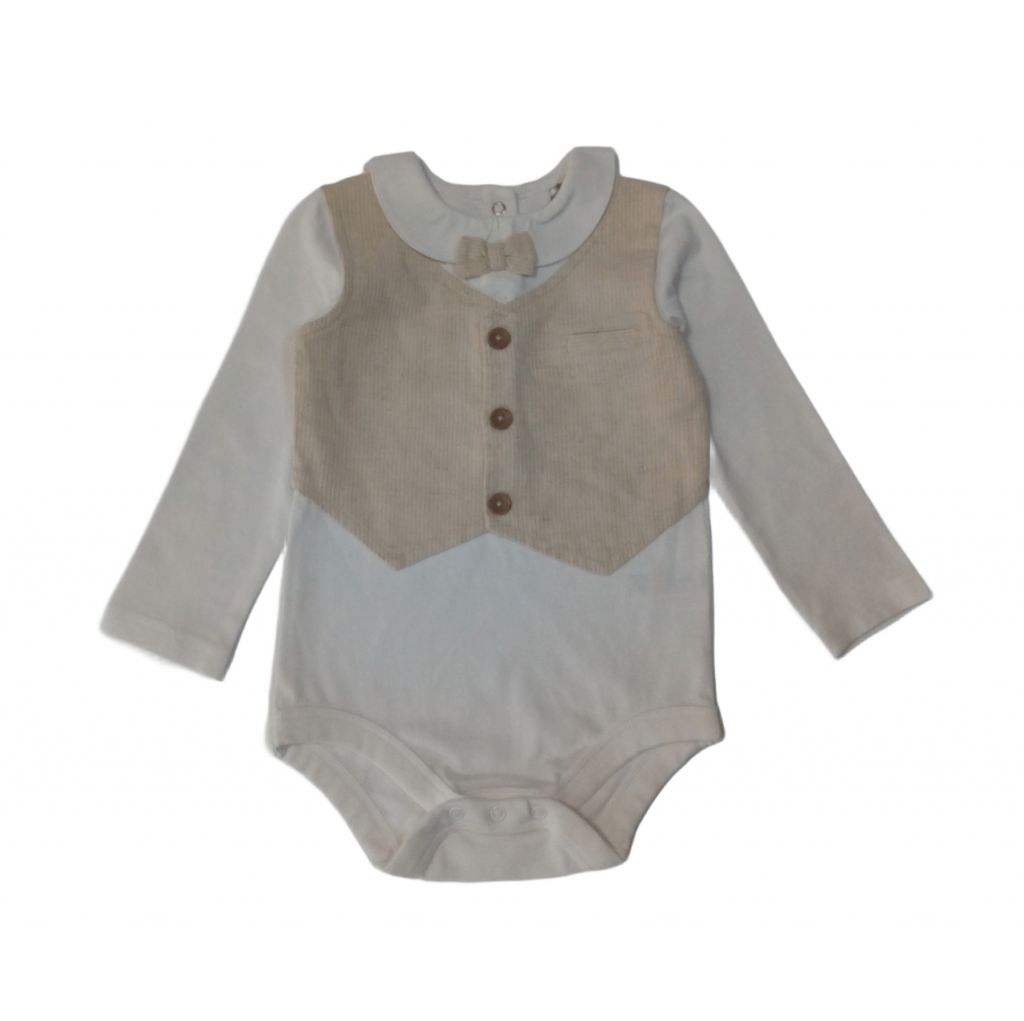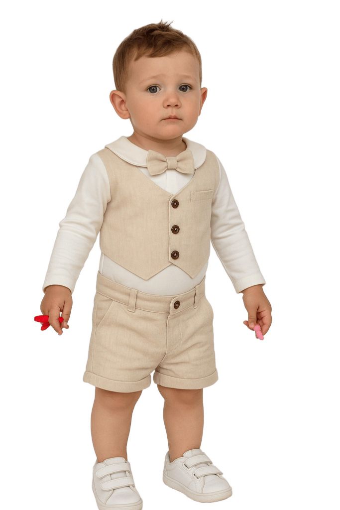 Комплектът се състои от бяло боди с дълъг ръкав и имитация на елече в предната част, бежови къси панталонки и папийонка.