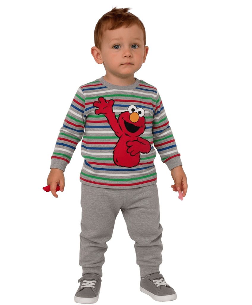 WHMM1797/993-3Комплектът се състои от блузка и долнище. Блузката е сива, с цветно райе в червено, зелено, синьо и бяло и голяма фигурка на Елмо от "Улица Сезам". Долнището е светлосиво.Състав: 100% памук
