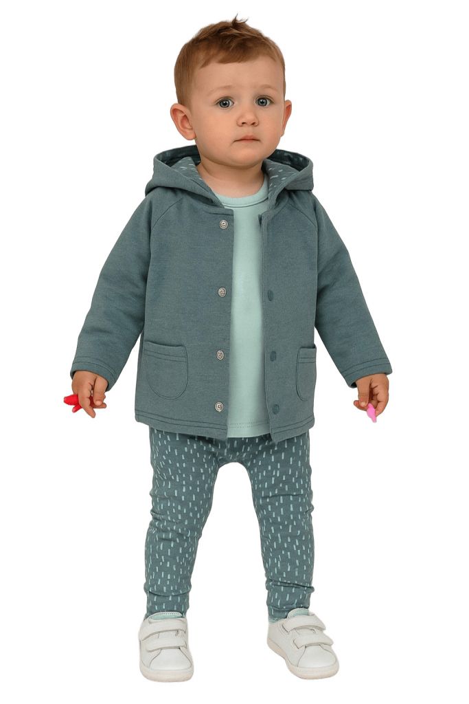 Комплектът се състои от жилетка, долнище и блуза. Жилетката е в тъмносив цвят, с качулка и две джобчета, закопчава се с тик-так копчета. Долнището е сиво, с вертикални сини чертички. Блузката е с дълъг ръкав в светлосиньо.
