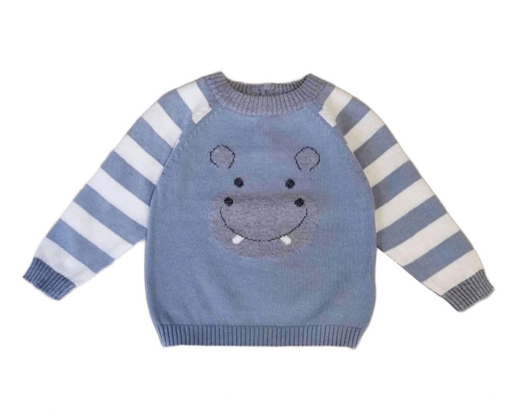 WPM2175Пуловерът е тънко плетиво в светлосин цвят, с ръкави б бяло райе и фигурка на хипопотам отпред. Има две копченца на гърба за по-лесно обличане.Марка: PrimarkСъстав: 100% памук
