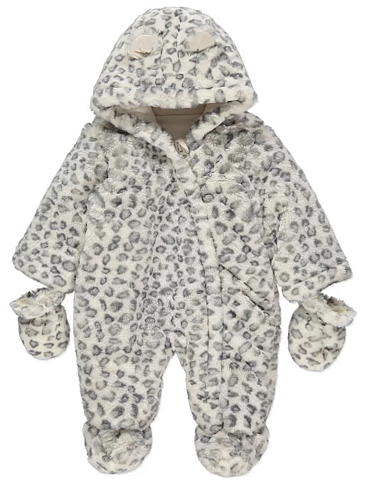 Космонавтът е от мек полар с къс косъм в леопардов десен. Закопчава се диагонално с цип, има качулка и ръкавички. Изключително мек и топъл, подходящ за най-студените зимни месеци.