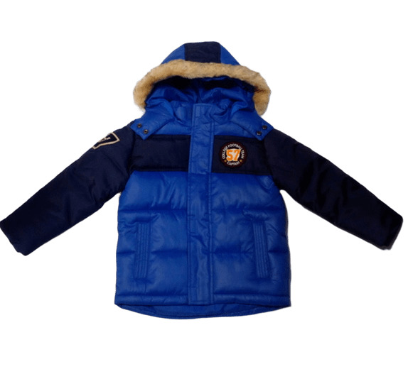 Дебело зимно яке в синьо, с тъмносини ръкави и лента на качулката, гърба и отпред. Подплатата е от син шушляков плат, а вътрешността е от пресована вата. Има емблема отляво с надпис College football team* captain* 57, два джоба и голяма цифра 57 на десния ръкав. Качулката е неподвижна, с кожена ивица по края.