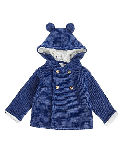 MSR229Жилетката е в син цвят, с двуредно закопчаване. Подплатата е бяла, с дребни фигурки на кученца и къщички. Има качулка с ушички.Марка: M&SСъстав:100% памук