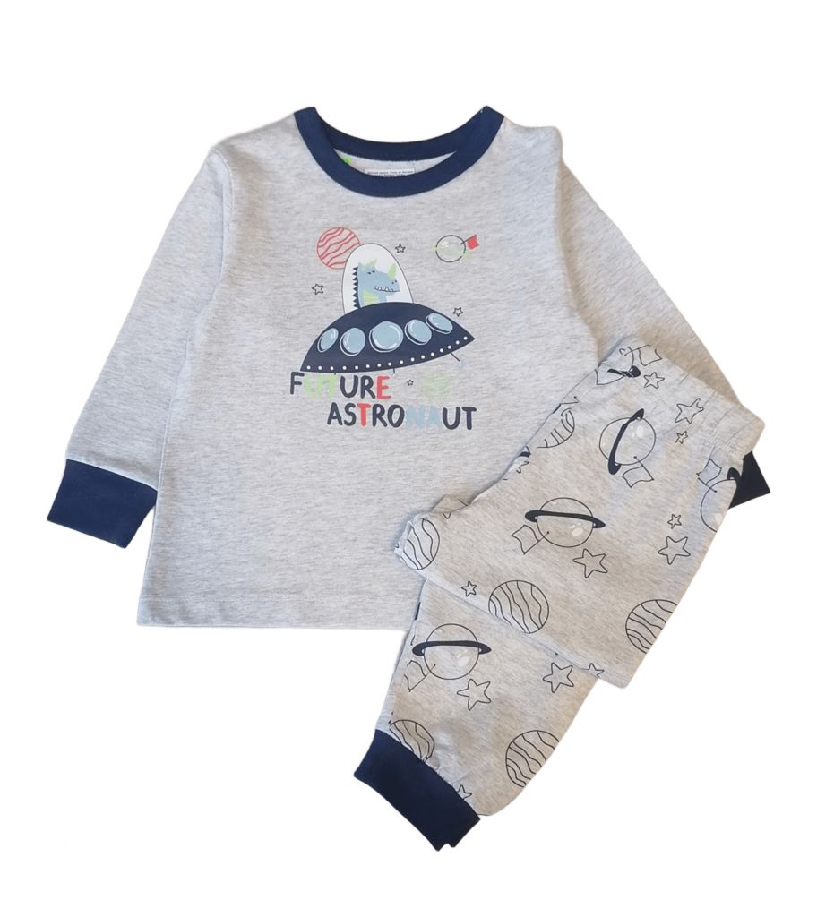 Пижамата е с дълъг ръкав и дълго долнище в сиво. Горнището има фигурка на космически кораб и цветен надпис отпред. Долнището е с малки черни фигурки на звезди и планети.