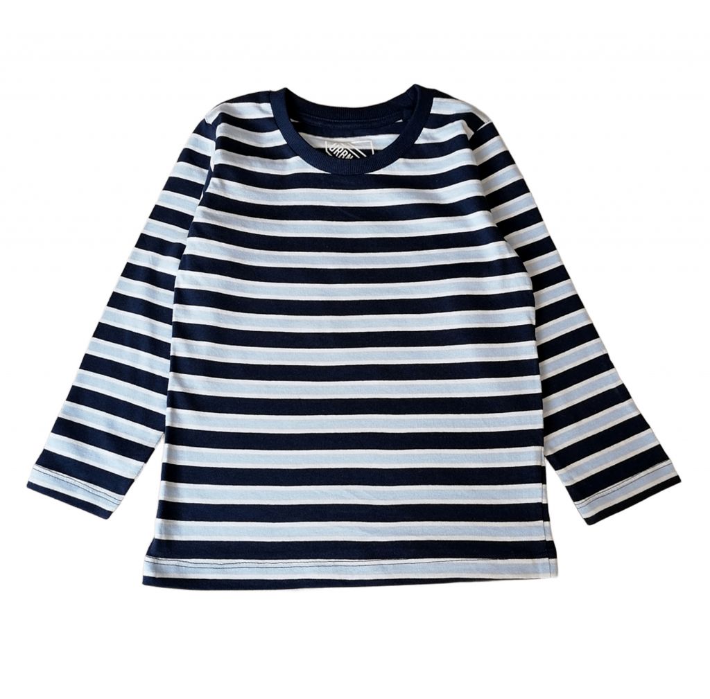 Блузата е с дълъг ръкав, на райе в тъмносиньо, светлосиньо и бяло.
