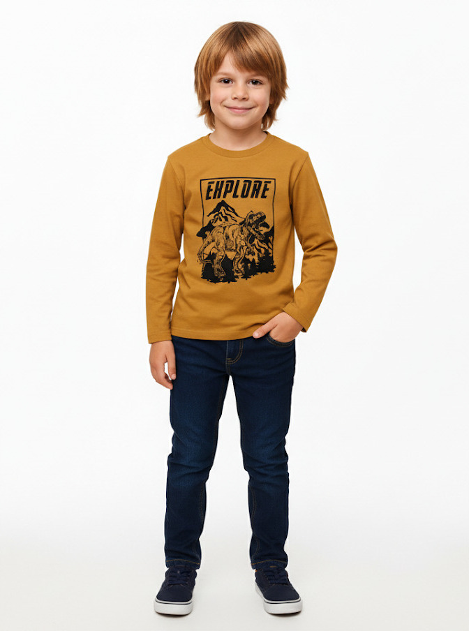 DMAT1238Блузата е в цвят горчица, с черна гумирана щампа на динозавър и надпис "EXPLORE". В долната лява част е разположен още един, по-малък надпис "T-REX".Марка: MatalanСъстав: 100% памук