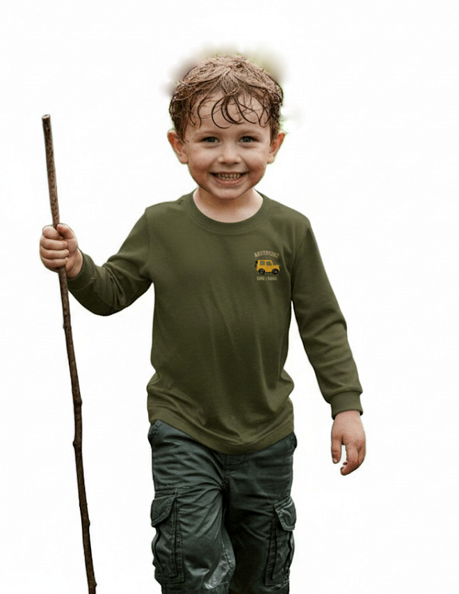 Блузата е с дълъг ръкав, в масленозелен цвят и малка фигурка на жълт джип отляво.