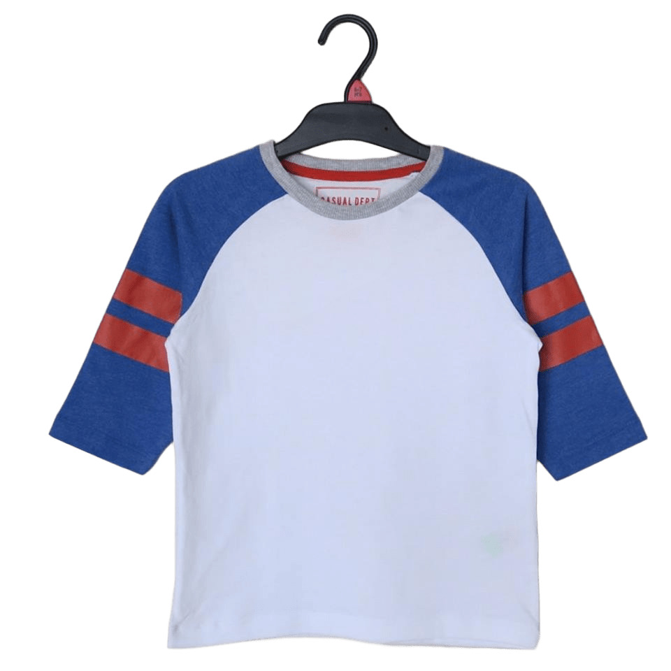 GMAT1023-2Тениската е в бяло, със сини 3/4 ръкави и две оранжеви ленти на тях.Марка: MatalanСъстав: тениска - 100% памук, ръкави - 60% памук, 40% полиестер