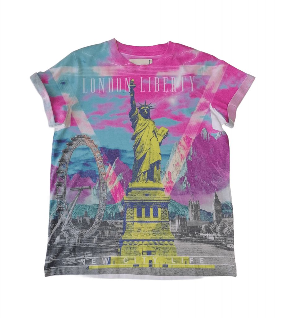 Тениската е с бял гръб и щампа на предницата в розово, жълто и синьо.