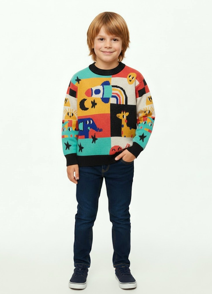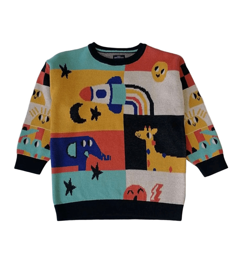 Плетен пуловер в бяло, охра, керемидено и синьо, с изображения на ракета, дъга и различни животни - жираф, слон, крокодил, разположени по ръкавите и в четири правоъгълника на предницата и гърба.Деколтето и краищата на ръкавите са в тъмносин цвят.