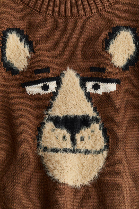 Плетен пуловер в кафяво, с изображение на бежова мечешка муцунка отпред.