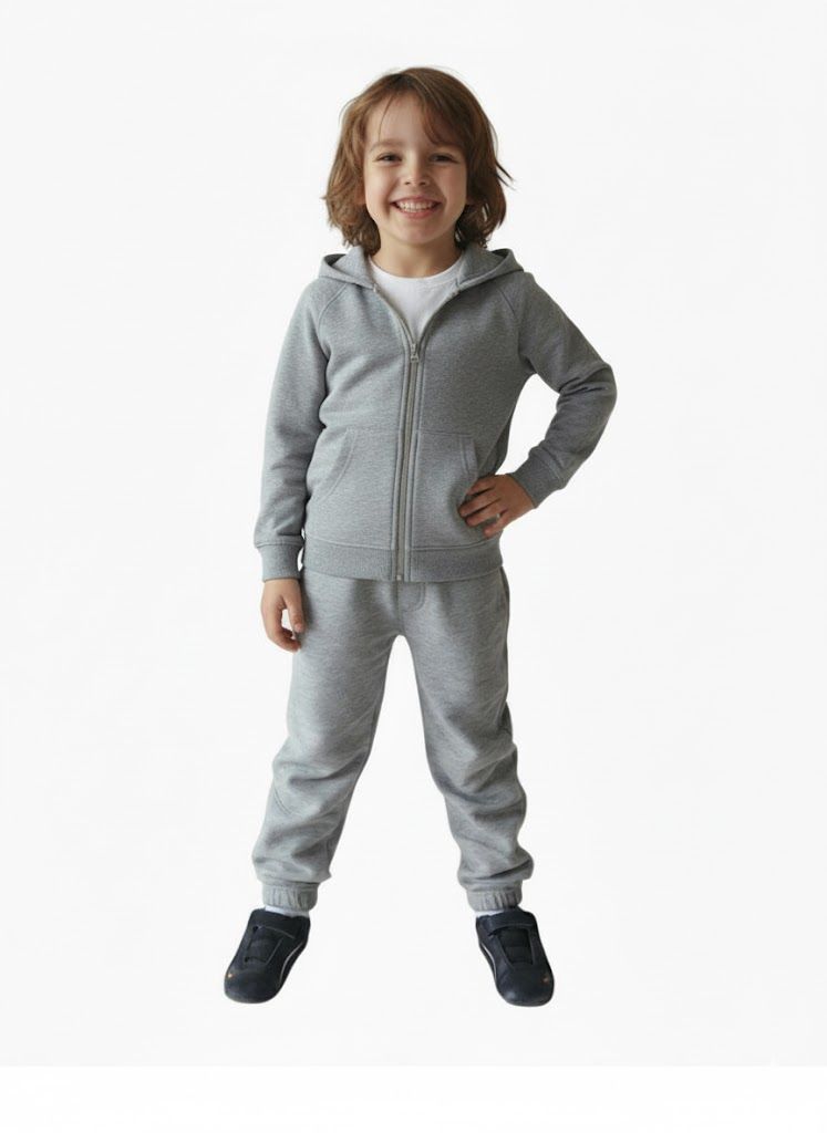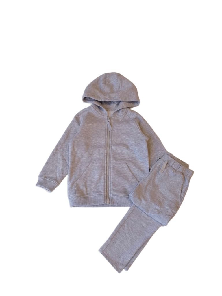 Комплектът се състои от суитшърт и долнище в светлосив цвят. Суитшъртът е с лека вата, качулка и джобове. Долнището е от плътно неватирано трико.