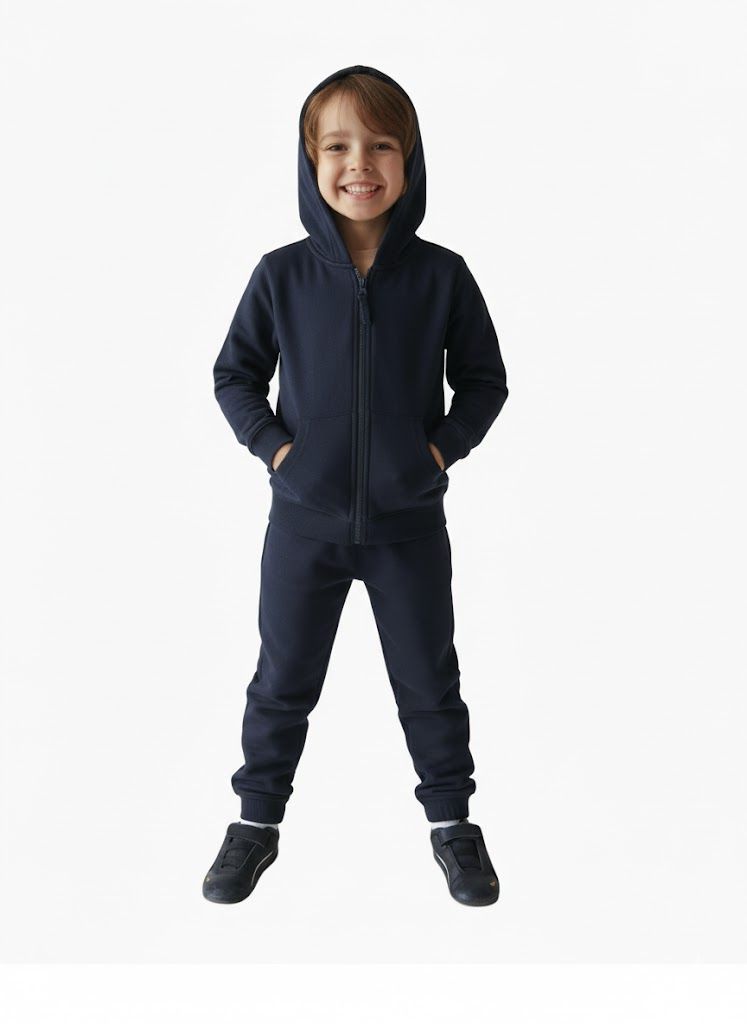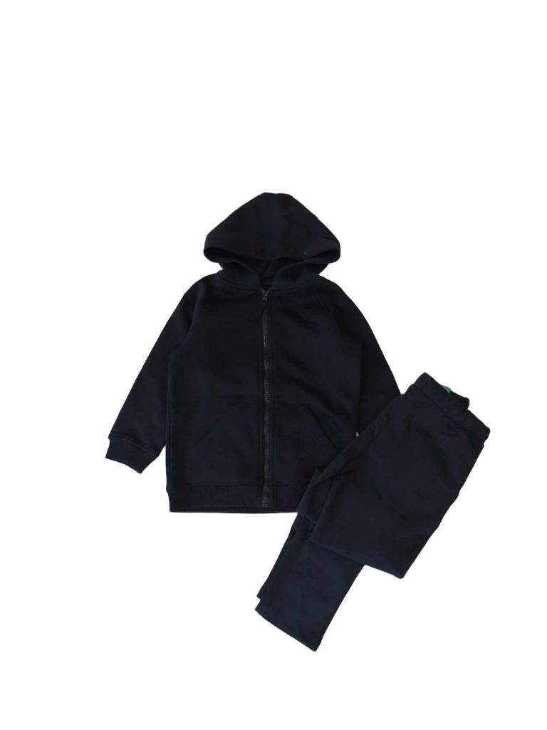 Комплектът се състои от суитшърт и долнище в тъмносин цвят. Суитшъртът е с лека вата, качулка и джобове. Долнището е от плътно неватирано трико.