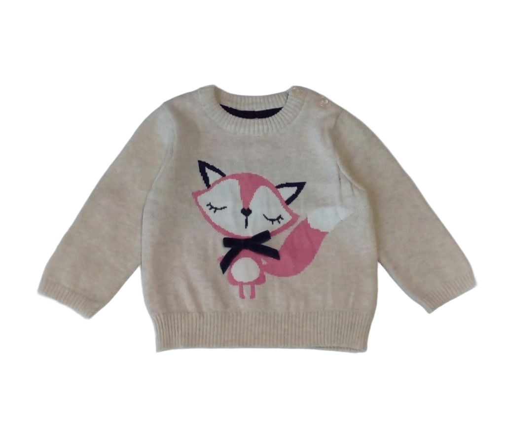 Пуловерът е тънко плетиво, в бежов цвят, с фигурка на лисиче в розово и тъмносиньо, с малка тъмносиня панделка от плюш. Има две копченца на лявото рамо за по-лесно обличане. На лактите има декоративни кръпки под формата на розово сърце.