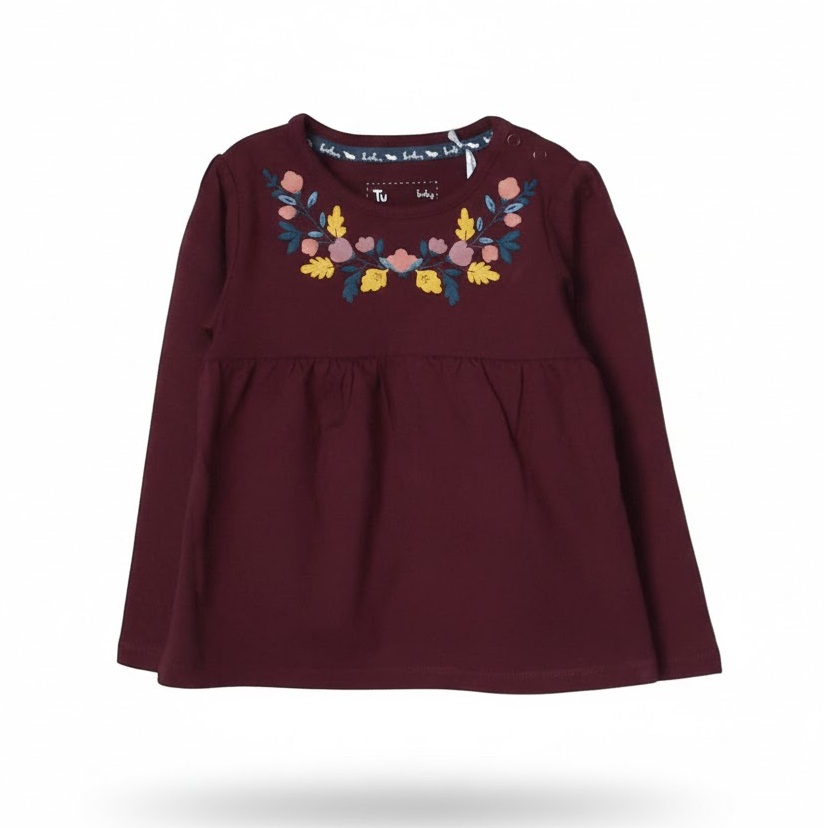 Блузката е с дълъг ръкав в цвят бордо. Има лек набор от басти в предната част и две тик-так копченца на лявото рамо за лесно обличане. На платката в горната част има щампа на цветя с висок релеф.