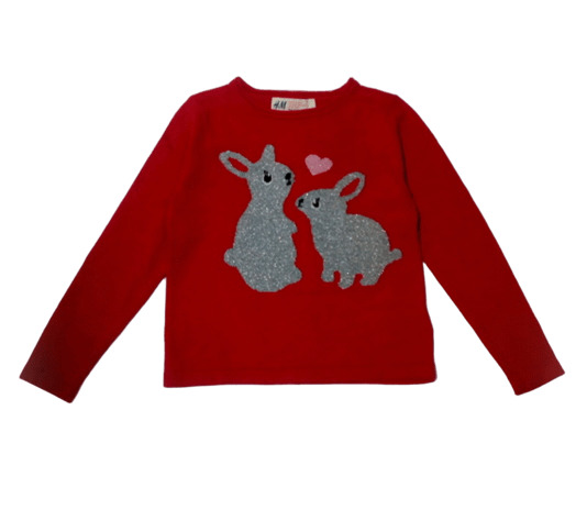 WHMF2001Пуловерът е тънко плетиво в червен цвят. Отпред има две фигурки на зайчета в сребристо и розово сърчице.Марка: H&MСъстав: 40% полиамид, 30% памук, 29% вискоза, 1% ламе