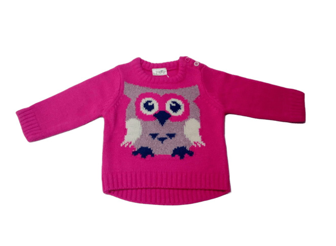 WТF2045Плетен пуловер в цикламен цвят с изображение на бухалче в бяло, тъмносиньо и бледолилаво отпред. На лявото рамо има две копченца за по-лесно обличане.Марка: F&FСъстав: 100% акрил