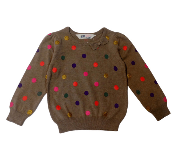 WHMF2037Пуловерът е тънко плетиво в млечнокафяв цвят. Има панделка от лявата страна на деколтето и разноцветни точки в лилаво, оранжево, розово, масленозелено и златисто.Марка: H&MСъстав: 100% памук