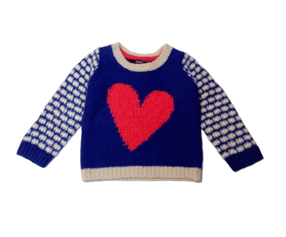 WGF2300Пуловерът е в тъмно лилав цвят, с червено сърце отпред. Ръкавите са с декоративна плетка в бяло и лилаво.Марка: GeorgeСъстав: 99% акрил, 1% вълна