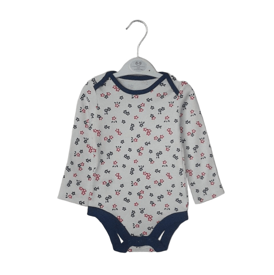 Бяло боди с дълъг ръкав на червени и сини цветя, с тъмносин кант.