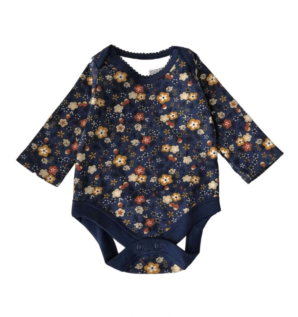 GBTY125Бодито е с дълъг ръкав, в тъмносин цвят с дребни цветчета в бежово, кафяво и охра. Около деколтето има нежна памучна дантела.Марка: TUСъстав: 100% памук