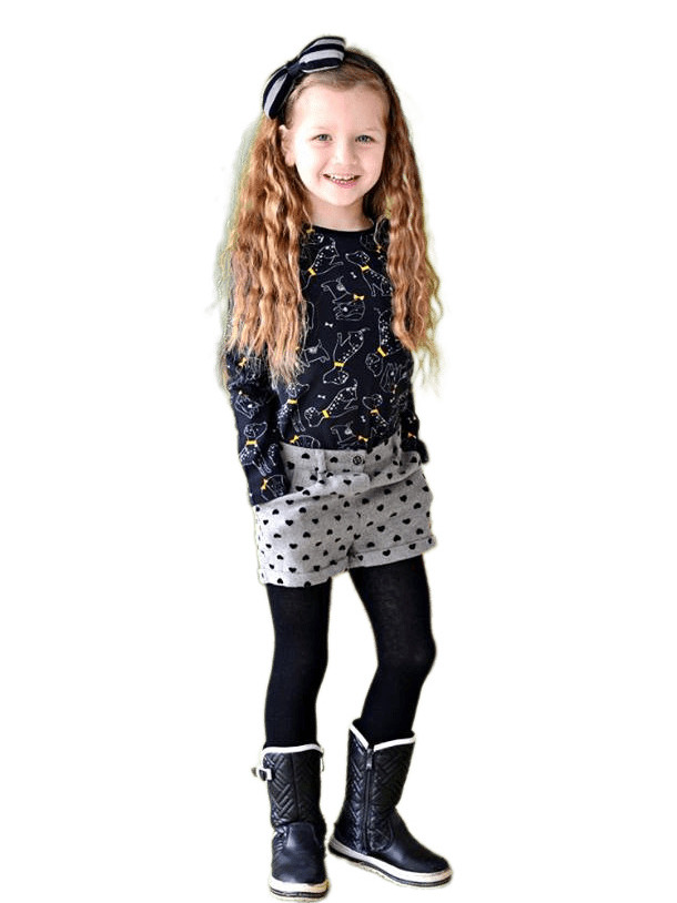 Комплектът се състои от къси панталонки и чорапогащник. Панталонките са от плътна материя в сиво, с черни сърчица. Имат два джоба отпред, два декоративни джоба отзад под формата на панделки и ластик в задната част на колана. Чорапогащникът е черен, без релеф.