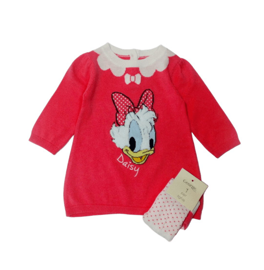 Комплектът се състои от рокличка и чорапогащник. Рокличката е тънко плетиво в цвят корал, с имитация на бяла якичка и фигурка на Патето Дейзи. Има три копченца на гърба за по-лесно обличане. Чорапогащникът е бял, на коралови точки.