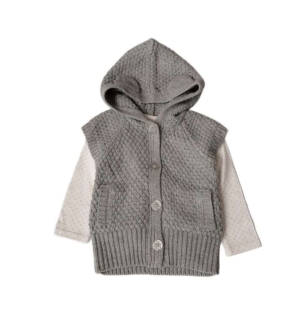 WPF1923Комплектът се състои от сиво елече с качулка и ушички и бяла блуза на дребни розови точки. Елечето е със сребриста нишка ламе и прозрачни копченца с брокат вътре.Марка: PrimarkСъстав: елече - 96% акрил, 4% лурекс; блуза - 100% памук
