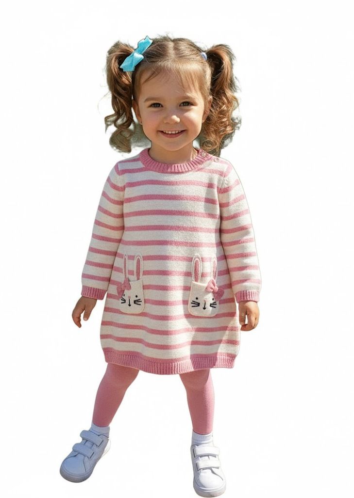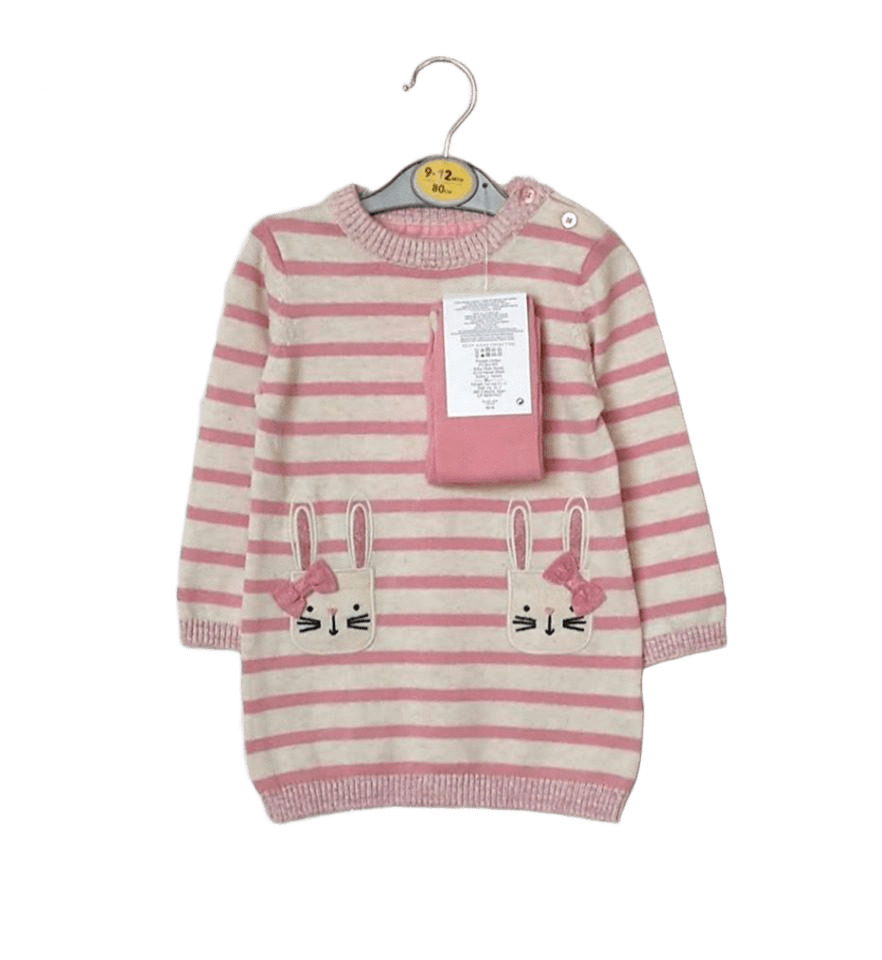 Комплектът се състои от рокля и чорапогащник. Роклята е тънко плетиво, на райе в бежово и цвят Пепел от рози. Отпред има фигурки на две зайчета, декорирани с панделки, бродерия и розов брокат. Чорапогащникът също е в цвят Пепел от рози.