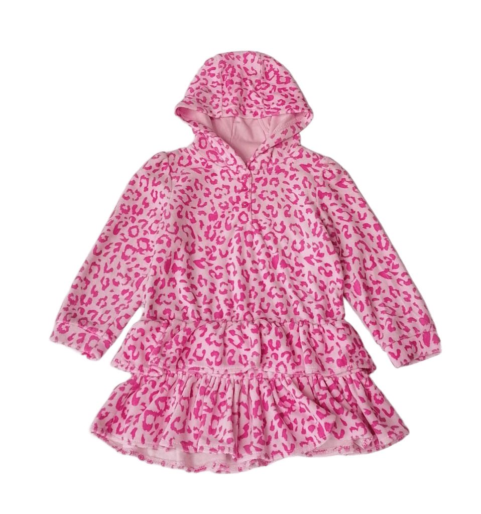 WPF179Рокличката е от мек поларен плат в розово, с тъмнорозова леопардова шарка. Има качулка, три копченца на деколтето и два реда волани в долния край.Марка: PrimarkСъстав: 100% полиестер