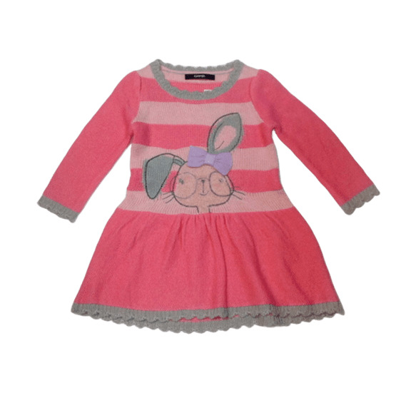 Плетена рокля в тъмно- и светлорозово райе.Отпред има изображение на зайче с лилава панделка. Долната част на поличката е с набор. По краищата на ръкавите, около врата и отдолу има тънка ивица светлосиво. Ръкавите и поличката са в тъмнорозов цвят.