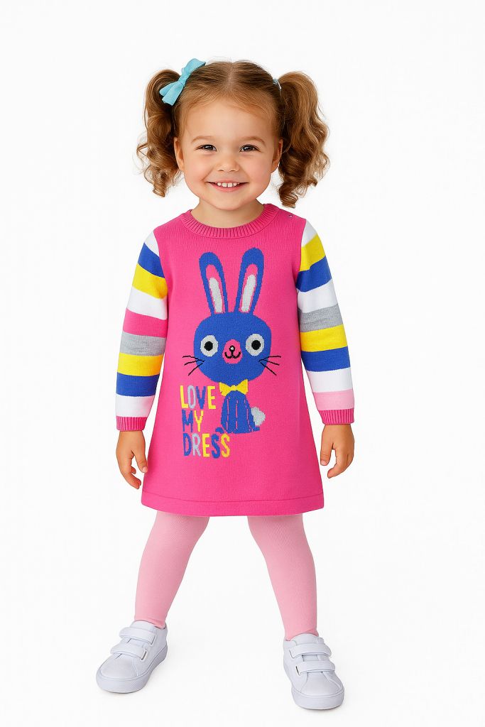 WGF1128Роклята е тънко плетиво, в тъмнорозов цвят. Ръкавите са на широки райета в бяло, синьо, жълто, сиво и розово. Отпред има фигурка на зайче и надпис " LOVE MY DRESS".Марка: GeorgeСъстав: 100% памук