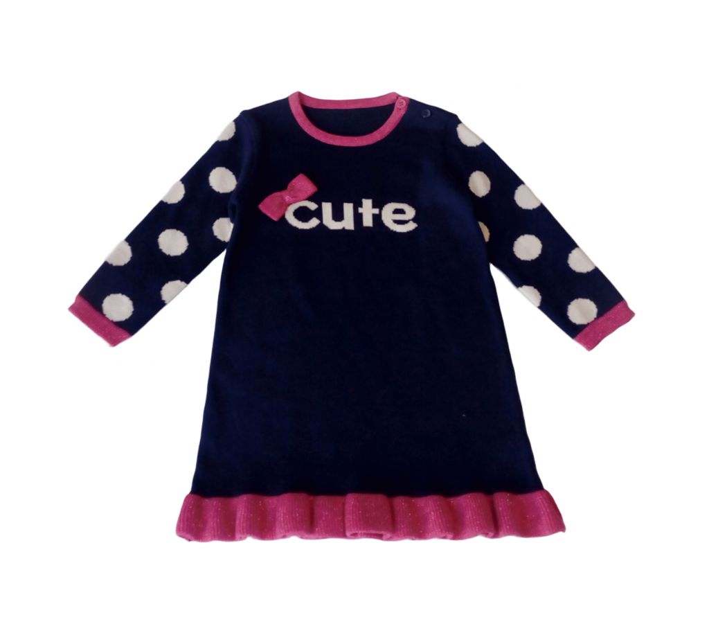 Рокличката е тънко плетиво в тъмносин цвят, с големи бели точки на ръкавите. Има бял надпис "CUTE" на предницата и тъмнорозова панделка до него. Ръкавите, деколтето и къдриците отдолу също са в тъмнорозово. В розовия цвят е втъкана и блестяща нишка ламе.