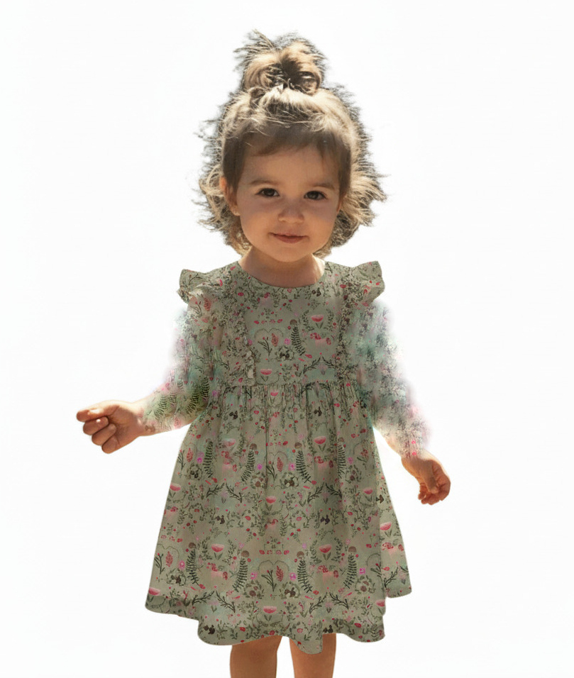 GMAT1248-1Роклята е с дълъг ръкав, в бледозелен цвят на дребни цветчета, животни и еднорози. На предницата има два реда вертикални къдрици, а поличката е свободна, с широк набор в талията.Марка: MatalanСъстав: 100% памук