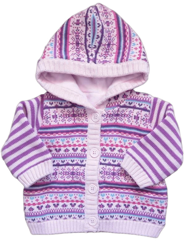 Жилетката е в розов цвят, с хоризонтални ивици от геометрични фигури в различни нюанси на розово и лилаво и раирани ръкави. Изцяло подплатена с розов полар.