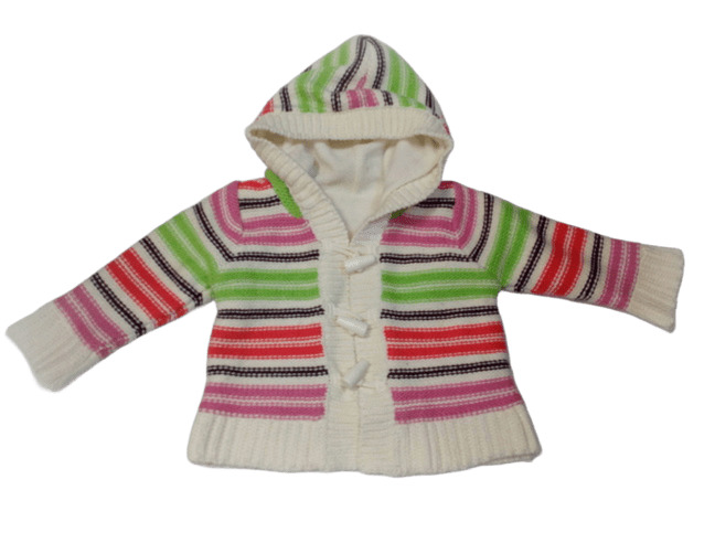 BG118Бяла плетена жилетка с качулка, на цветно райе в розово, червено, тъмнокафяво и резеда. Закопчава се с три копчета. Жилетката е с ватирана подплата от бял полар.Марка: GeorgeСъстав: 100% акрил , подплата - 100% полиестер